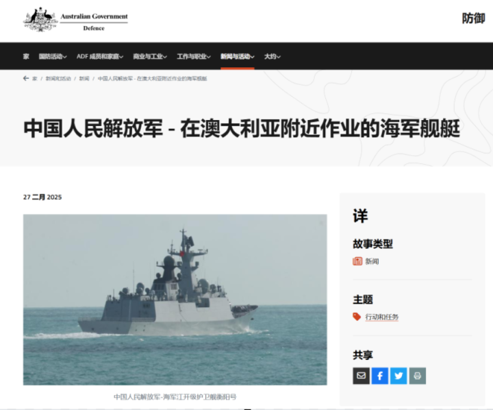 据澳大利亚国防部官网2月28日发布的消息,中国人民解放军海军(PLA-N)第107 特遣队,由“江凯”级护卫舰“衡阳”号、“刃海”级巡洋舰“遵义”号和“福池”级补给舰“微山湖”号组成,在阿德莱德西南偏南约320海里(593公里)处作业。